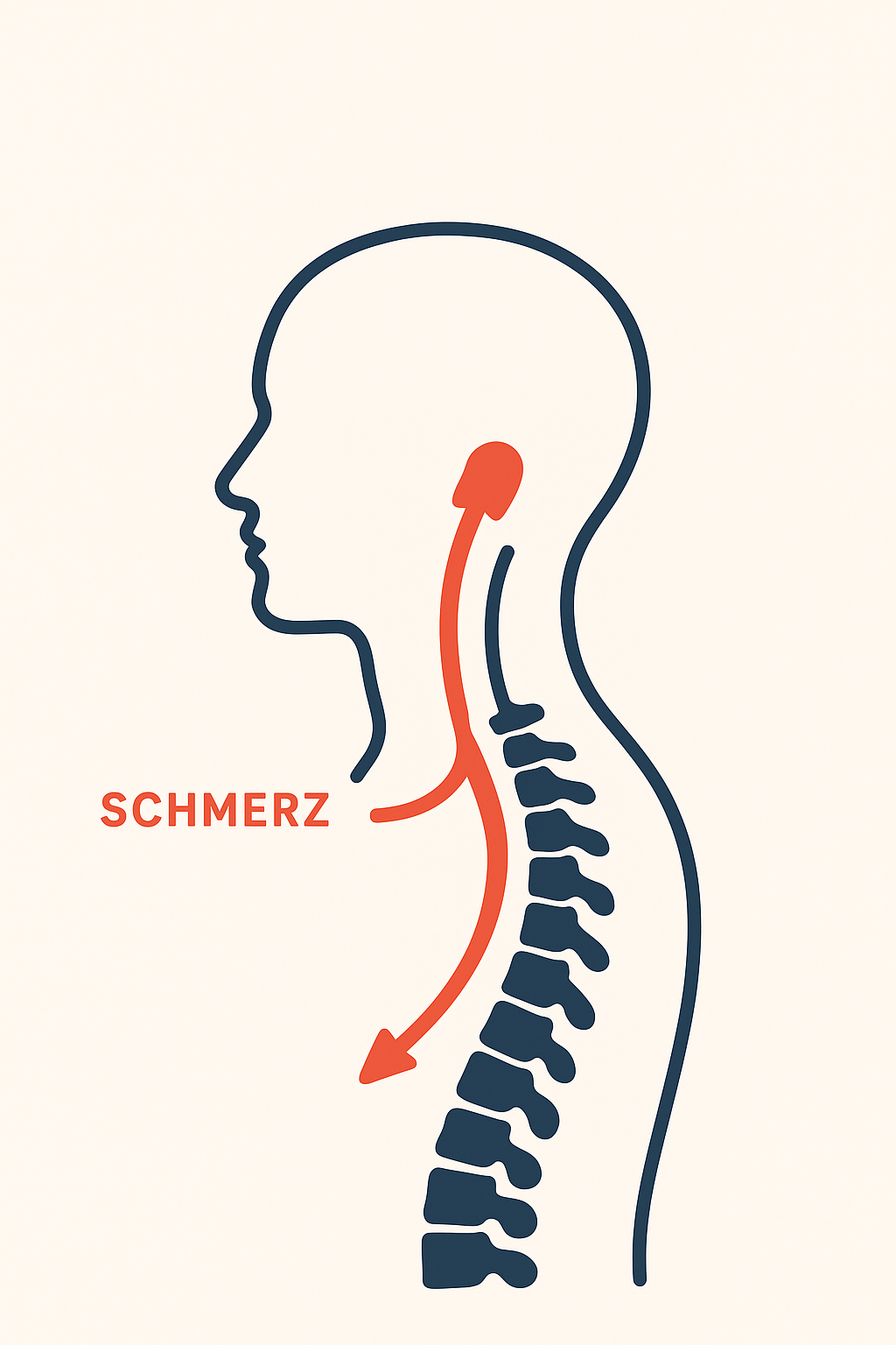 Wenn ein schmerzhafter Reiz – etwa durch Druck, Überdehnung oder Verletzung – auftritt, wird er von Nozizeptoren (Schmerzrezeptoren) in Haut, Muskeln, Gelenken oder Organen aufgenommen.